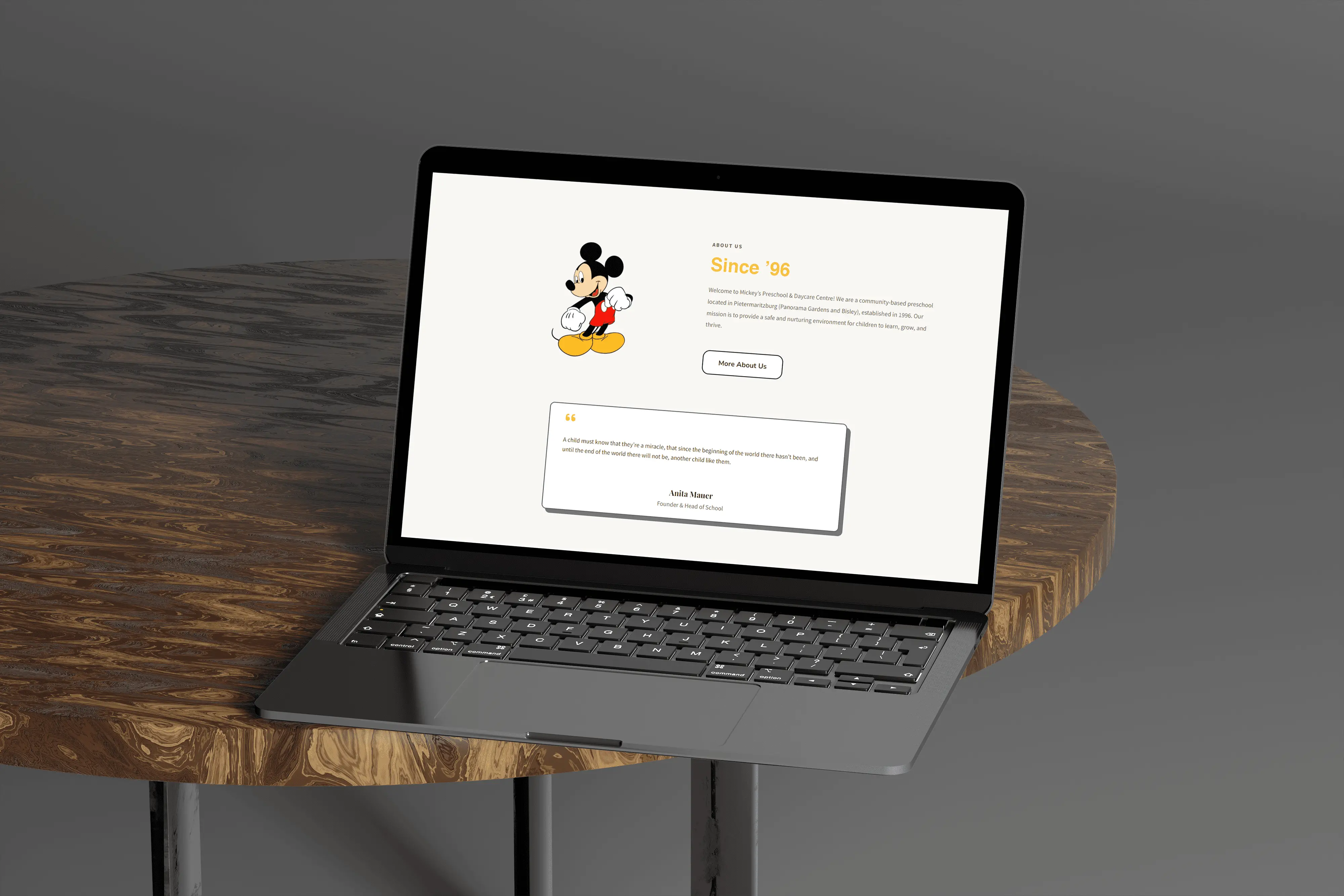 For Mickey's Preschool & Daycare Centre, a beloved local preschool in Pietermaritzburg, I handled both the design and maintenance of their website, guaranteeing consistent uptime. The redesigned website not only elevated their online presence but also significantly increased sales and engagement. Moreover, by implementing user-friendly features and informative content, we streamlined the enrollment process, saving valuable time for both the staff and parents by minimizing the need for direct communication.